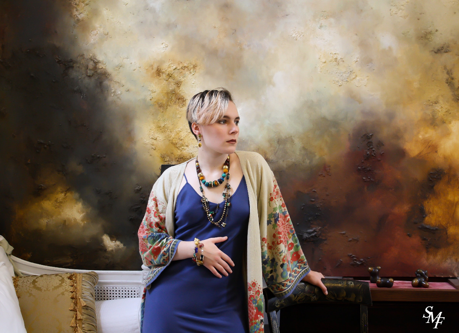 Colors abound in the canvases teeming with a delicate dreamlike rendering. Each room and reading nook welcomes and inspires. The juxtaposition of antiquity amid modern composition feels very familiar to me. It's as if it echoes the heart of my own creative spirit - a union of old and new artfully combined in seamless expression.
